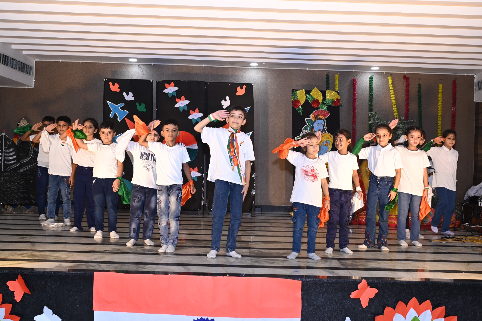 कार्यक्रम का शुभारंभ देशभक्ति से ओत-प्रोत गीतों के साथ हुआ। कलर्स विभाग के नन्हे-मुन्ने छात्रों ने “आई लव माई इंडिया” और “जिस देश में गंगा बहती है” जैसे गीतों पर मनमोहक नृत्य प्रस्तुत कर दर्शकों का दिल जीत लिया। इसके साथ ही, छात्रों ने “सारे जहां से अच्छा” गीत गाकर उपस्थित सभी लोगों में देशप्रेम की भावना जागृत की। इस गीत को दर्शकों ने पूरे उत्साह के साथ सुना और सराहा।
