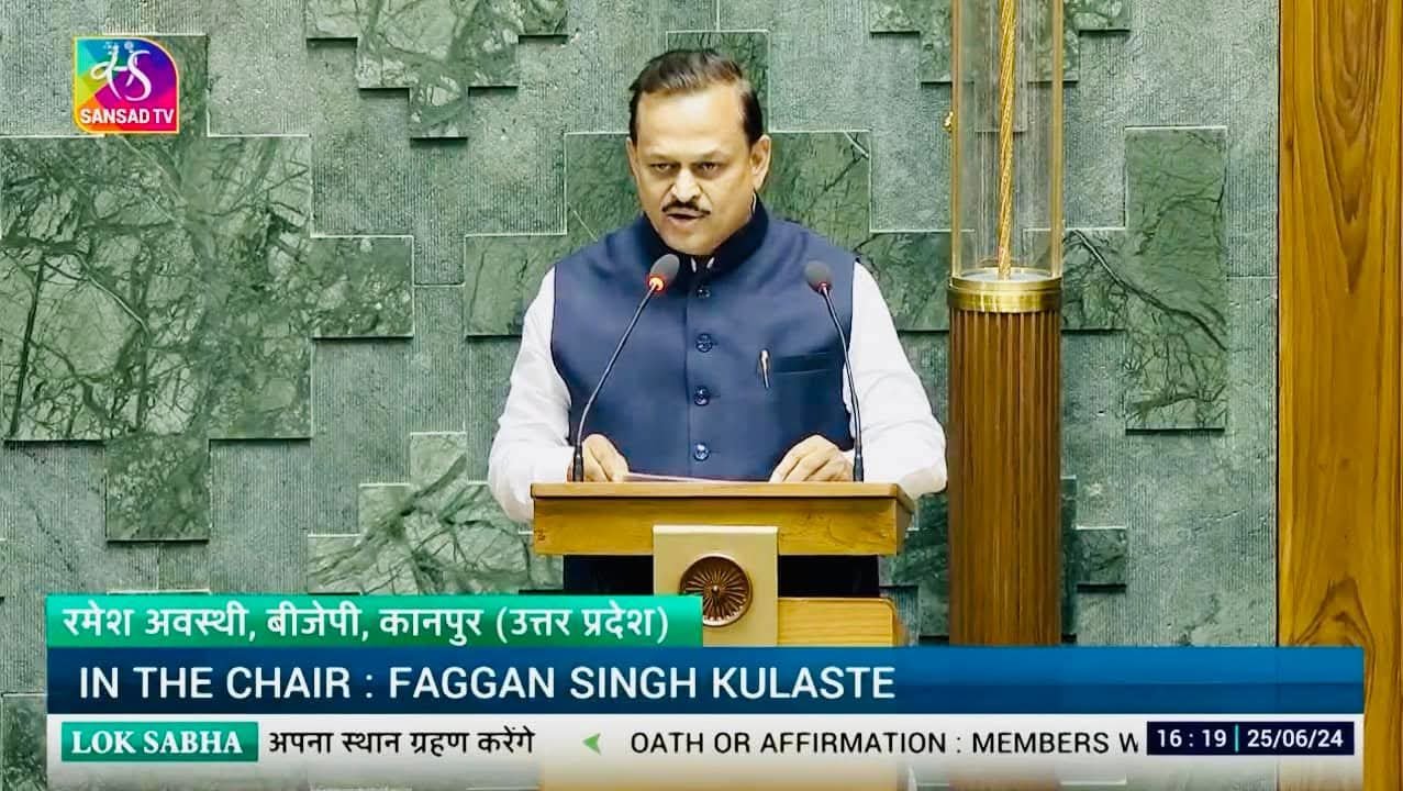 संसद में शपथग्रहण के वक़्त की फ़ोटो जब सांसद रमेश अवस्थी ने शपथ ली थी । इमेज साभार : संसद टीवी - indianews24x7.com
