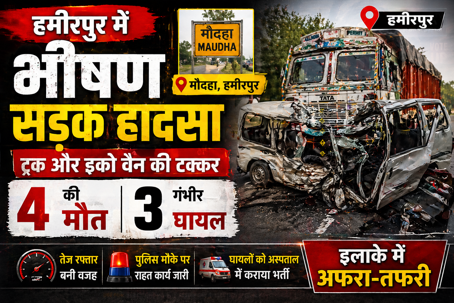 हमीरपुर (उत्तर प्रदेश): हमीरपुर जिले में मंगलवार देर रात एक भीषण सड़क हादसे ने चार परिवारों की खुशियां छीन लीं। मौदहा कोतवाली क्षेत्र के अंतर्गत नेशनल हाईवे-34 पर तेज रफ्तार ट्रक और इको वैन के बीच आमने-सामने जोरदार टक्कर हो गई। हादसा इतना भयावह था कि इको वैन पूरी तरह क्षतिग्रस्त हो गई और उसमें सवार चार लोगों की मौके पर ही दर्दनाक मौत हो गई, जबकि तीन अन्य गंभीर रूप से घायल हो गए। प्रारंभिक जानकारी के अनुसार, इको वैन में सवार लोग किसी पारिवारिक कार्यक्रम से लौट रहे थे। इसी दौरान सामने से आ रहे तेज रफ्तार ट्रक ने वैन को टक्कर मार दी। टक्कर की तीव्रता इतनी अधिक थी कि वैन के परखच्चे उड़ गए और अंदर बैठे लोग बुरी तरह फंस गए। हादसे के बाद मौके पर चीख-पुकार मच गई और आसपास के लोग तुरंत सहायता के लिए दौड़े।